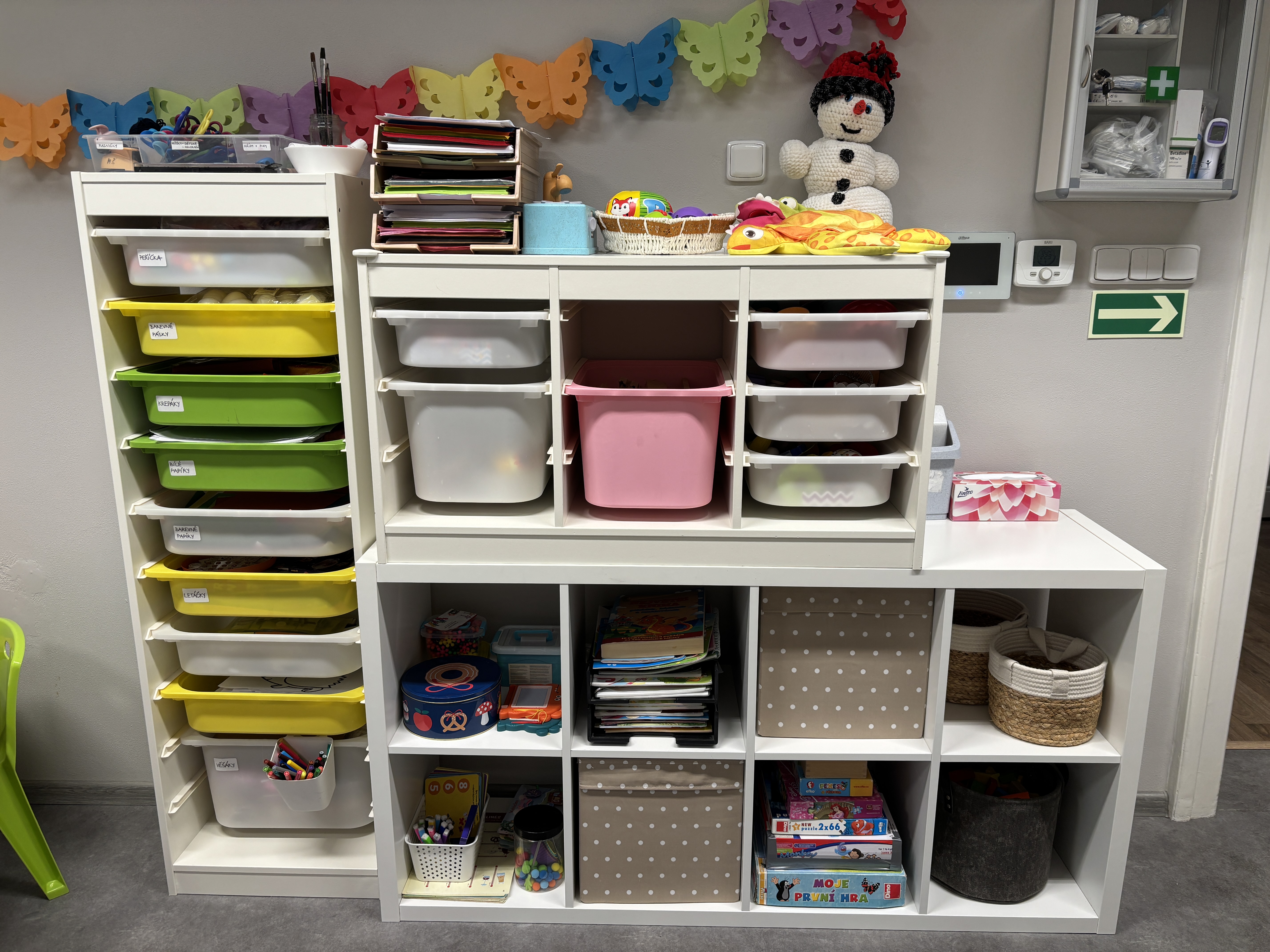 Hned u vstupu se nachází šatna, která slouží k odkládání oblečení a botiček. Každé dítě á své vyhrazené místo, aby se tu cítilo jako doma a učilo se postupně samostatnosti.